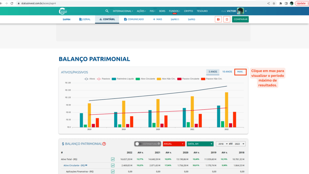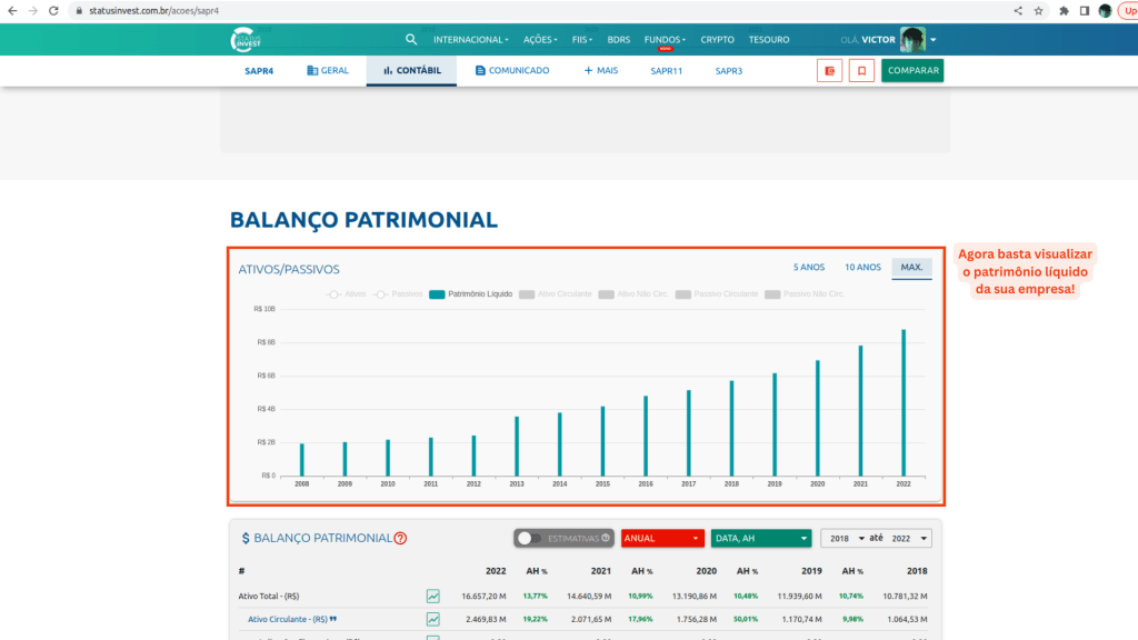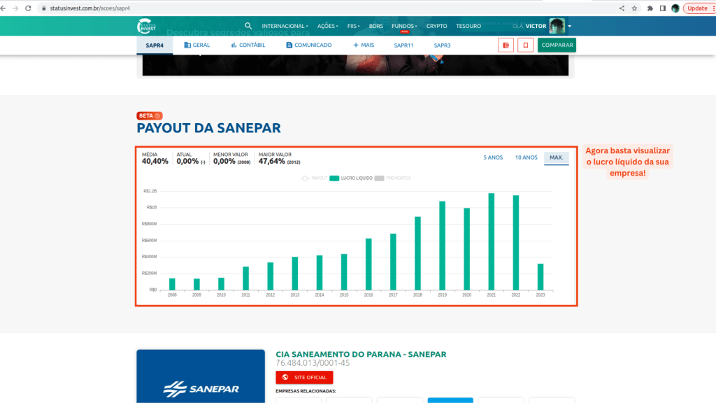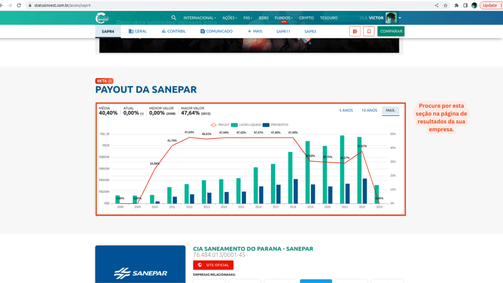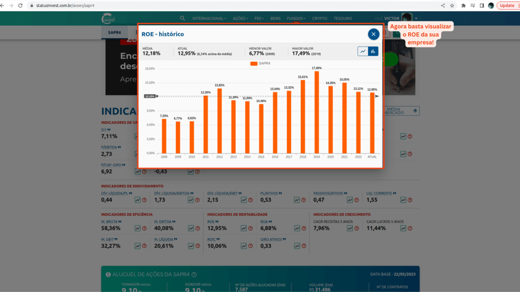 Vamos verificar agora o ROE da nossa empresa, eu estarei acessando a página da Sanepar na Status Invest e você acessa a página de resultados e indicadores da sua empresa na Status Invest. Bora lá verificar como analisar o ROE na prática!