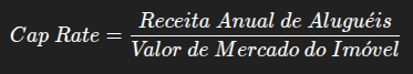 O Cap Rate (ou taxa de capitalização) mede quanto o imóvel rende em relação ao seu valor de mercado.